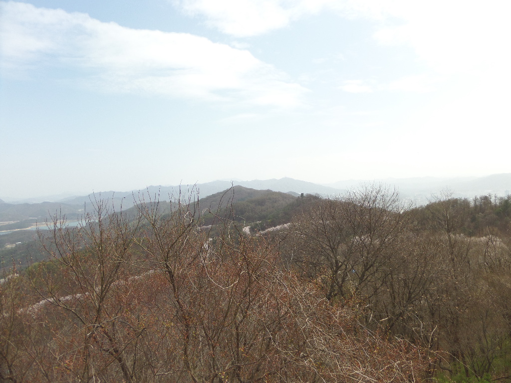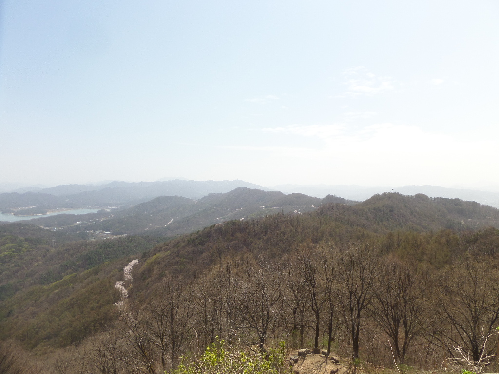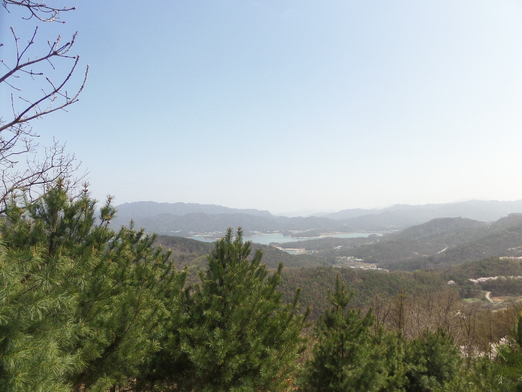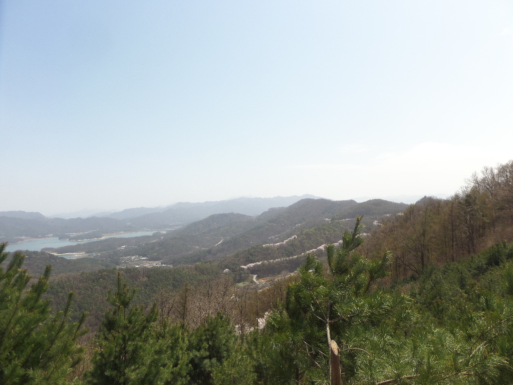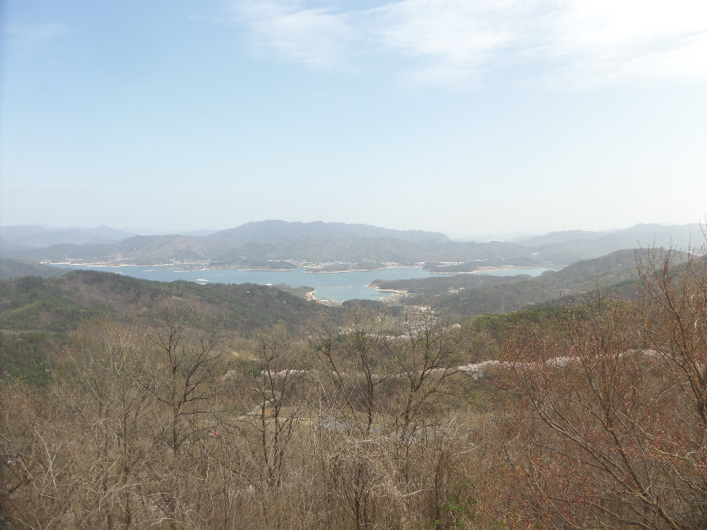 건너편에 계족산 정상이 보이고요 아래 하얀선은 황톳길을 환희 밝혀주는 벚꽃입니다.