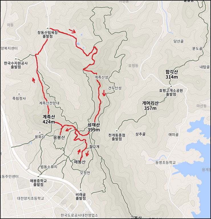 계족산성 남문~육각정~오형제나무~성재산~임도육거리~매봉산~임도육거리~응봉산~계족산 정상~